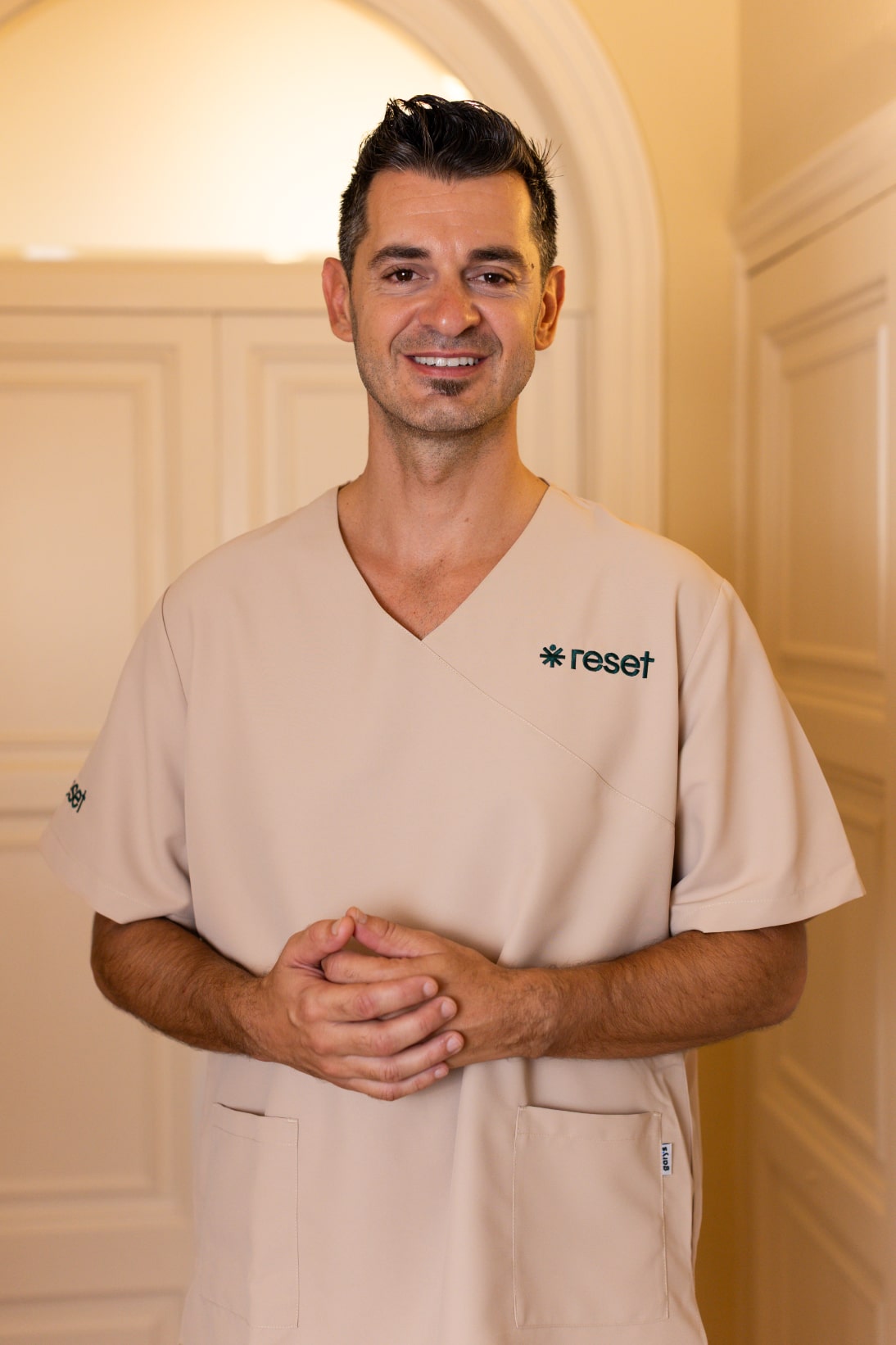 Manifesto Fisioterapia Reset somos personas tratando a personas, por eso lo primero que haremos es escucharte, sin prisa. Te miraremos de cerca, con una visión global, para ofrecerte un tratamiento hecho a medida. Y seremos honestos contigo: si no somos los más adecuados para ti, te pondremos en manos del mejor. Porque no sólo trabajamos con los profesionales más reconocidos del sector, también formamos a quienes vendrán. Aquí aprenderás a entender tu cuerpo, a escuchar lo que necesita, viendo resultados con tus propios ojos desde el primer día. Estaremos a tu lado, acompañándote paso a paso, apagando los síntomas que te generan malestar, hasta que se reactive el cuerpo y puedas volver a disfrutar de la vida, con los cinco sentidos. No hay nadie como tú, por eso no hay una clínica como la nuestra. Equipo Somos un equipo de fisioterapeutas, osteópatas, especializados en el bienestar y la recuperación integral, con una especial dedicación a casos raros y complejos. Contacto Conoce a los fundadores que impulsan Reset Fernando Ruiz Fundador y co-director. especialista en fisioterapia maxilofacial Almudena Gil FundadorA y co-directorA. especialista en fisioterapia RESPIRATORIA